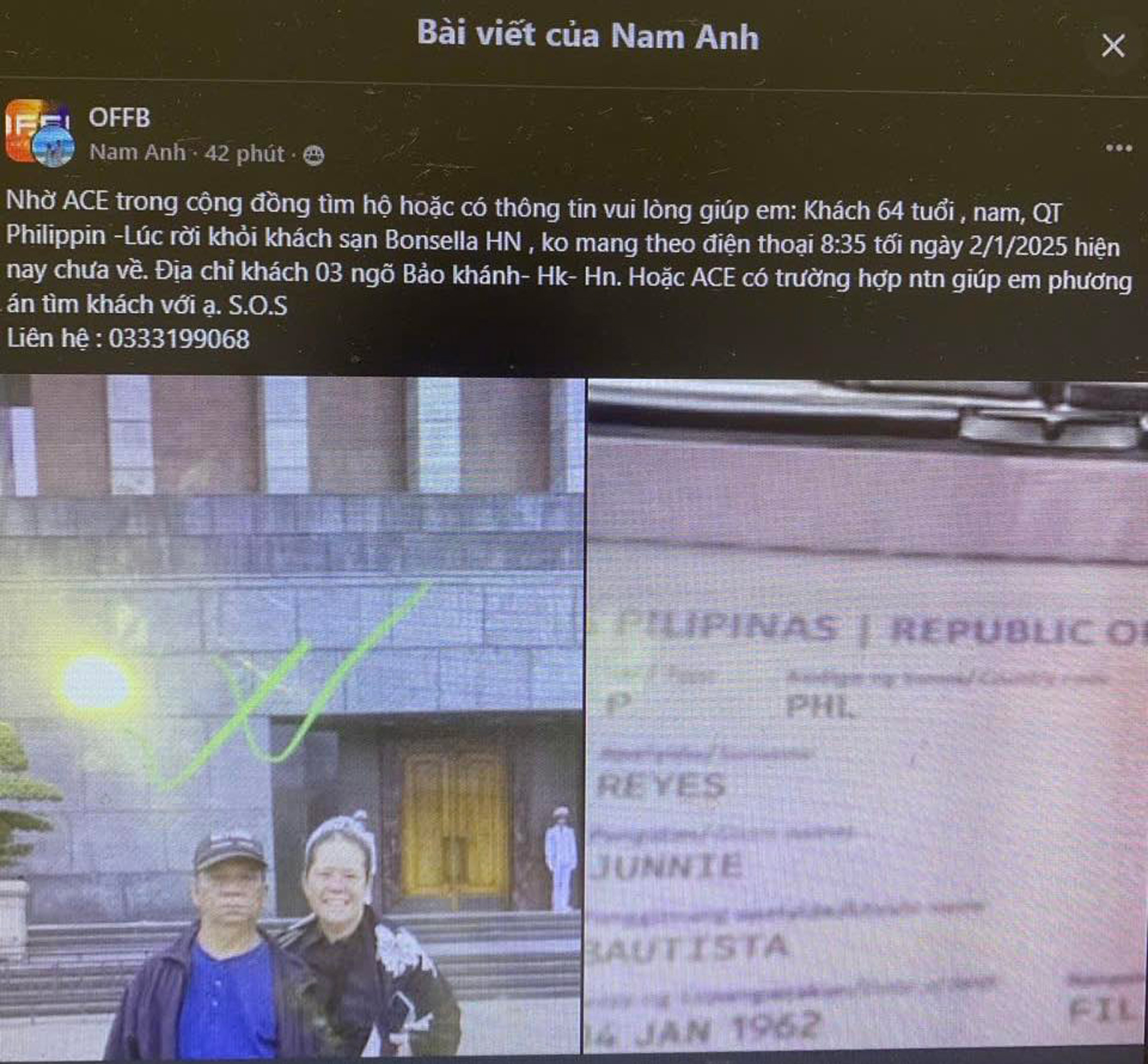 On the evening of 02 January, an urgent message searching for a missing family member was shared on social media and the OFFB forum. The person reported missing was a 64-year-old male tourist, a Philippine national, who had gone missing in the Hoan Kiem Lake area after leaving without his phone and personal identification documents.