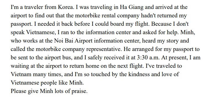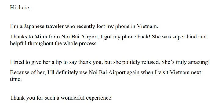 Shortly after, Noi Bai International Airport received a second letter from a Japanese traveler who had unfortunately lost his phone. Once again, an employee named "Minh" provided assistance, leading to the recovery of the lost item. What impressed the passenger most was that when he offered a tip as a token of gratitude, "Minh" "politely refused."