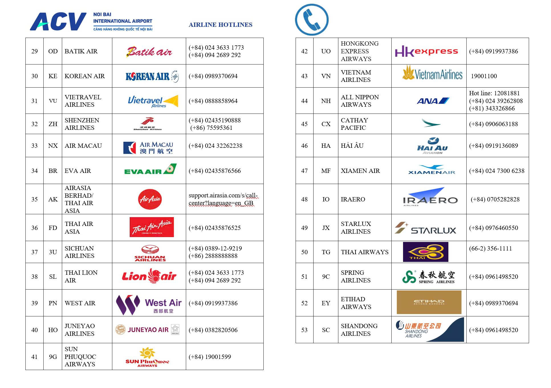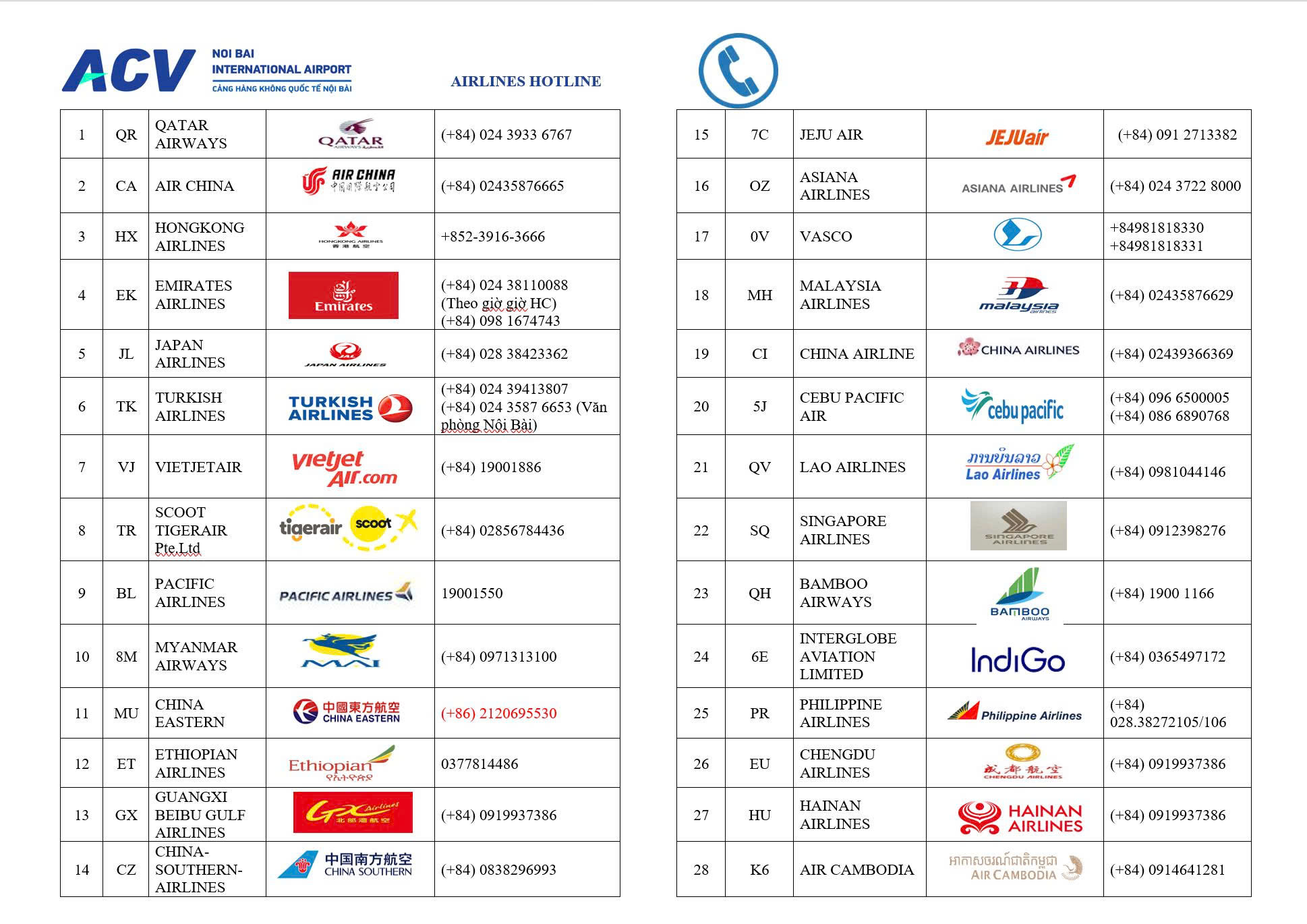 CÁC HÃNG HÀNG KHÔNG ĐANG KHAI THÁC TẠI CẢNG HKQT NỘI BÀI