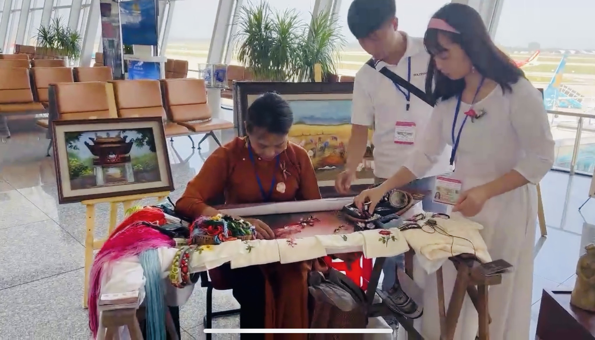 Hành khách được chiêm ngưỡng nghề thêu tranh thủ công, được ngắm những bức tranh thêu lớn được nghệ nhân thực hiện kéo dài hàng tháng, những chiếc khăn đũi, lụa tơ tằm của Việt Nam được tô điểm bởi những họa tiết thêu tay đẹp mắt.