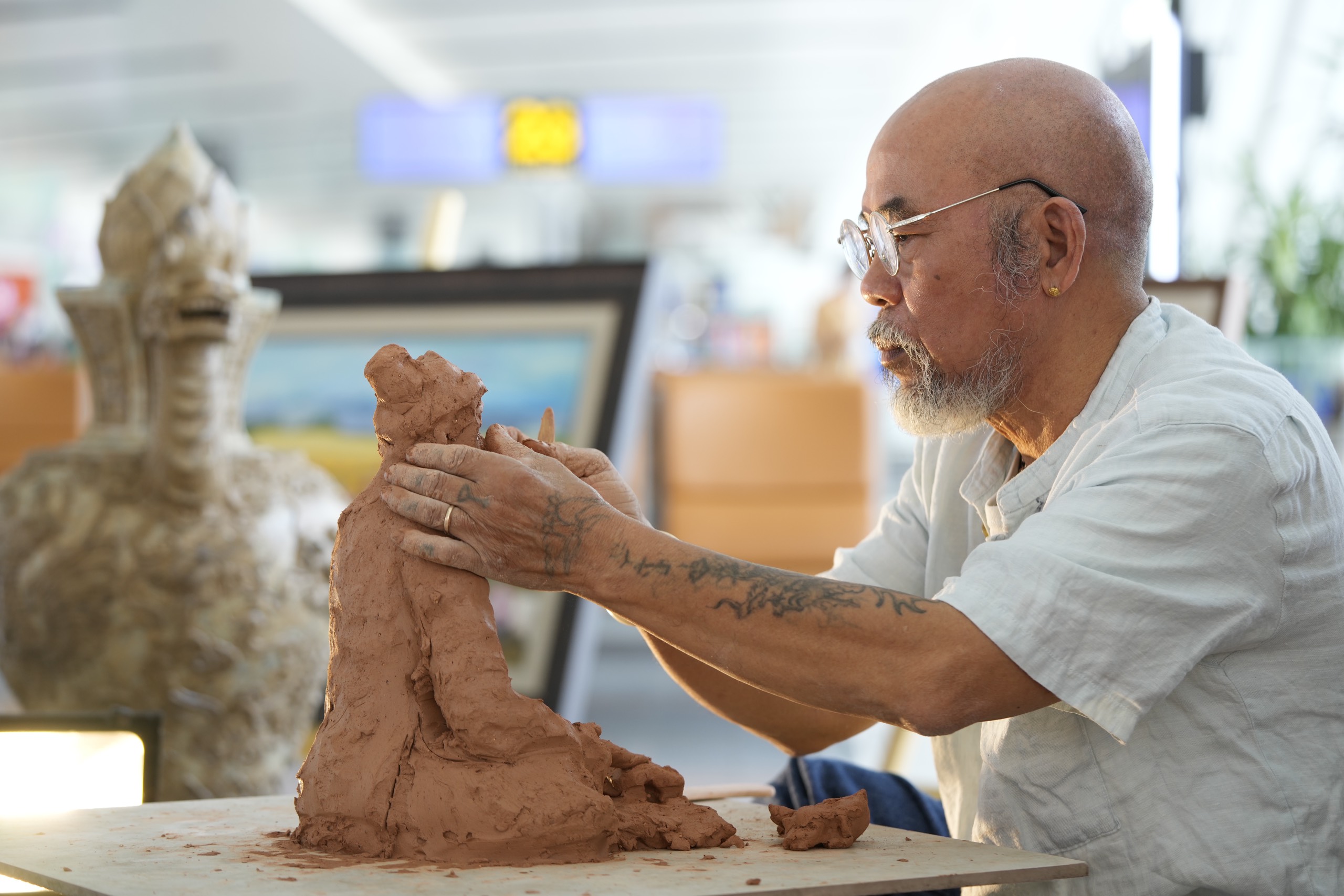 Nhà điều khắc Đỗ Bá Quang với tác phẩm được thực hiện tại Nhà ga T2 Nội Bài