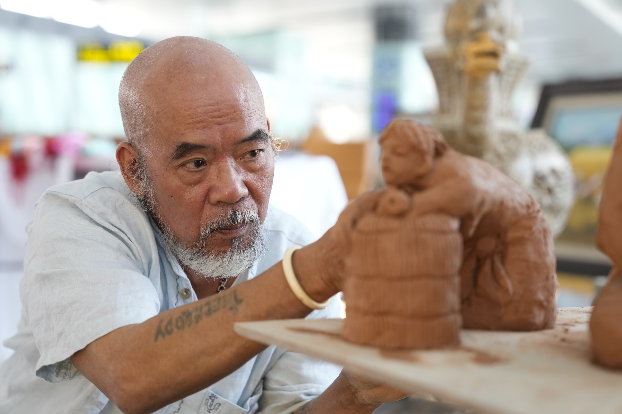 Các nghệ nhân, nhà điêu khắc gốm cũng làm thu hút sự chú ý của hành khách với các tác phẩm được chế tác ngay tại sân khấu Cảng HKQT Nội Bài. Nhiều vị khách nước ngoài kiên nhẫn ghi hình lại quá trình từ lúc nghệ nhân nhào đất cho đến lúc sản phẩm được điêu khắc thành hình hài trong sự trầm trồ của người xem.